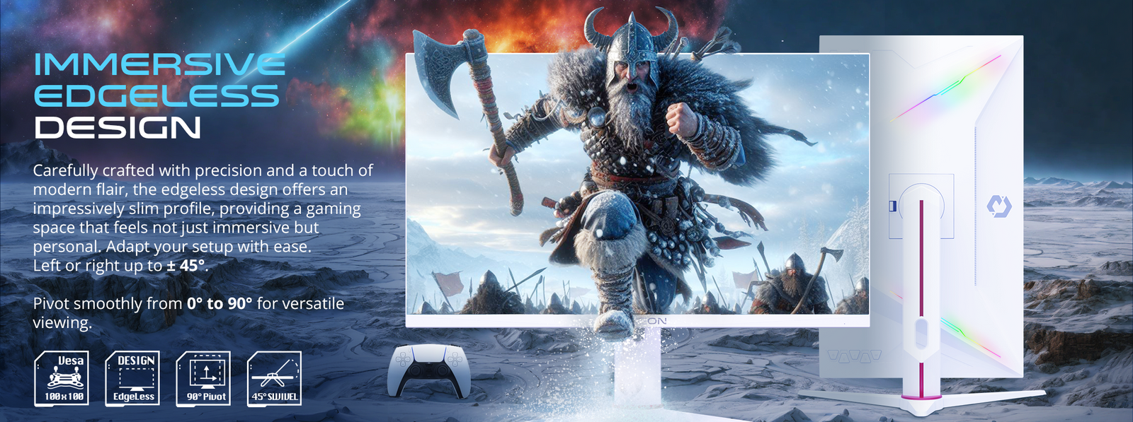 - Style & Function: Sleek white design, RGB elements, VESA mount, easy